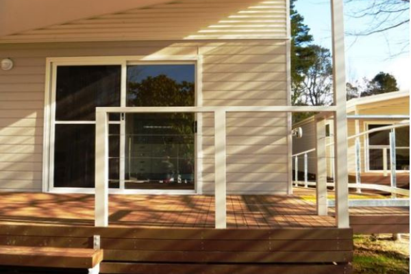 - Decking area with outdoor setting and ramp.