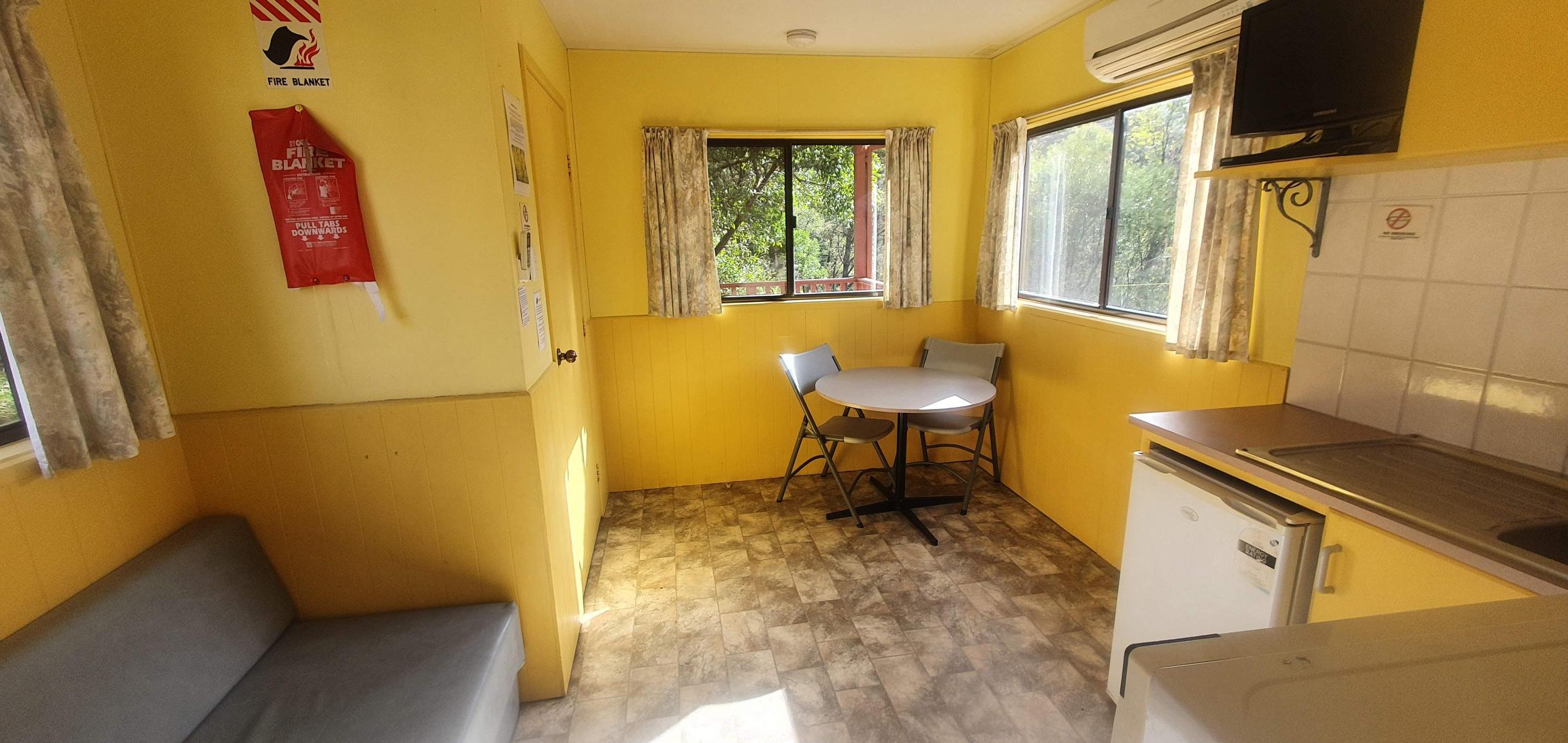- Kitchen with crockery, cutlery, pots, pans microwave, kettle, and toaster